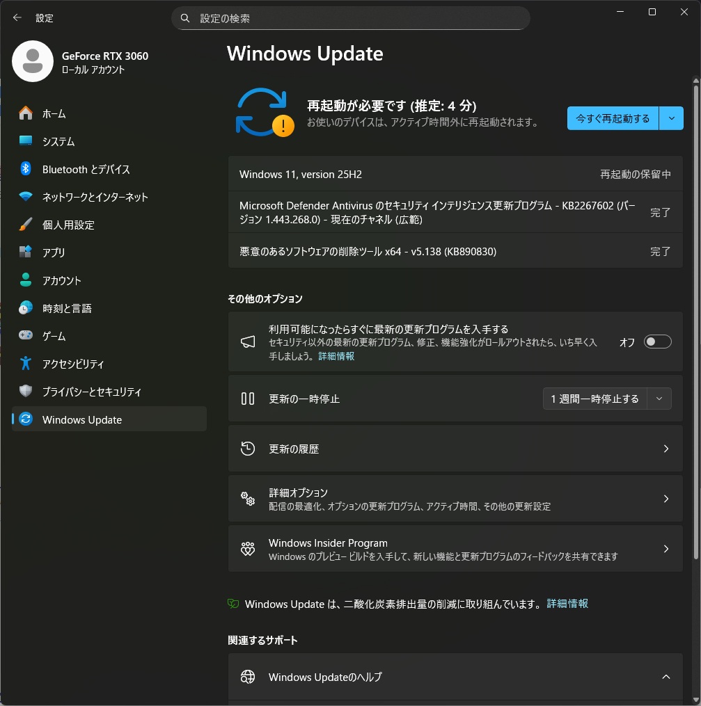 ちょっと目を離していたらいつの間にかWindows 11,version 25H2のダウンロードが始まっておりそのままインストールへと進んだ。