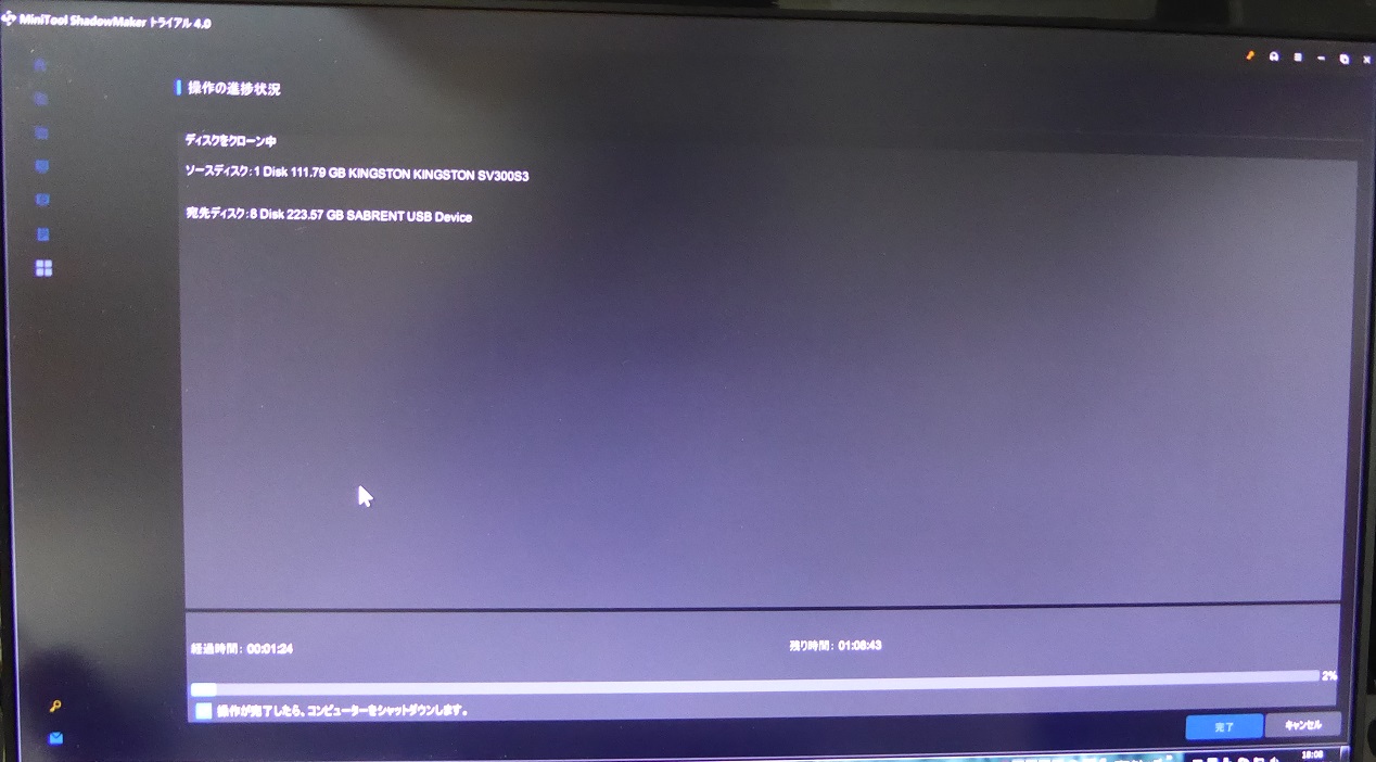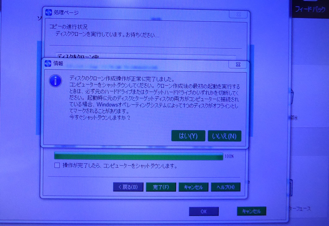 クローンが終わるとパソコンをシャットダウンしてSSD250GBを外してSSD500GBを取り付け電源を立ち上げると正常に起動した。