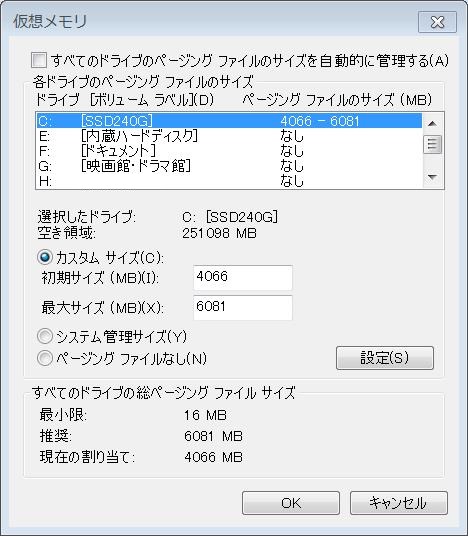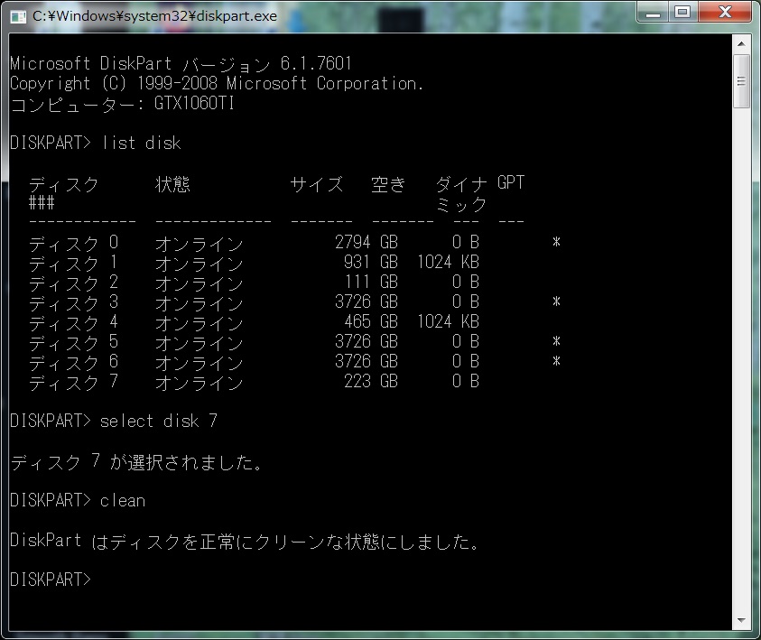 SSD250GBはデジカメのファイルの保存用にしたかったので、普通にフォーマットしただけではシステムで予約済みとかが残ってしまうので、Youtubeで調べてコマンドを打ってクリーン作業をしてから初期化をして全部使えるようにした。
