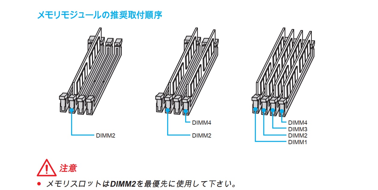 マニュアルを見ると2番と4番に同じメモリを刺すようになっていた。