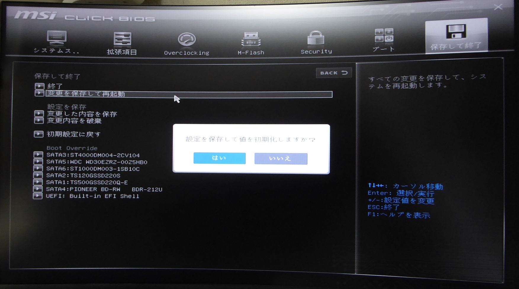 F1を押すとH170A PC MATEのUEFIメニューが出たので、一番右のフォルダに入り、「変更を保存して再起動」を選んで再起動させて、終了。
