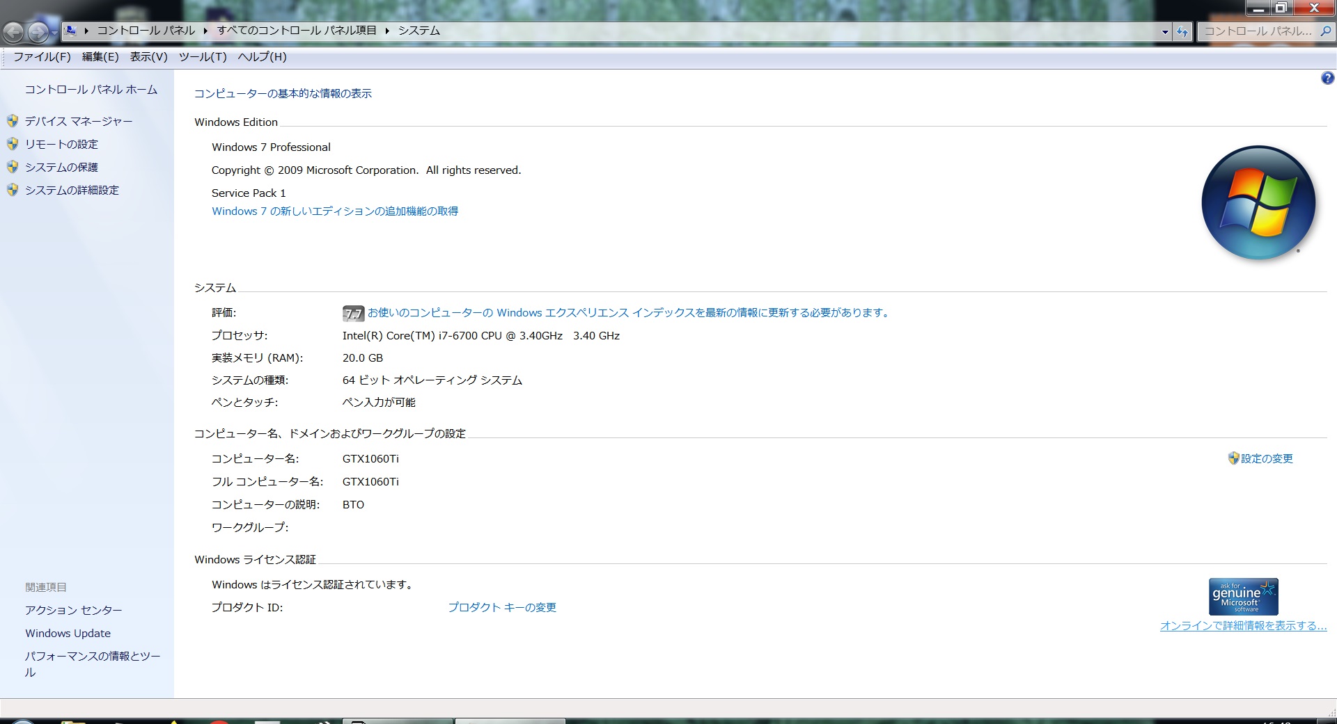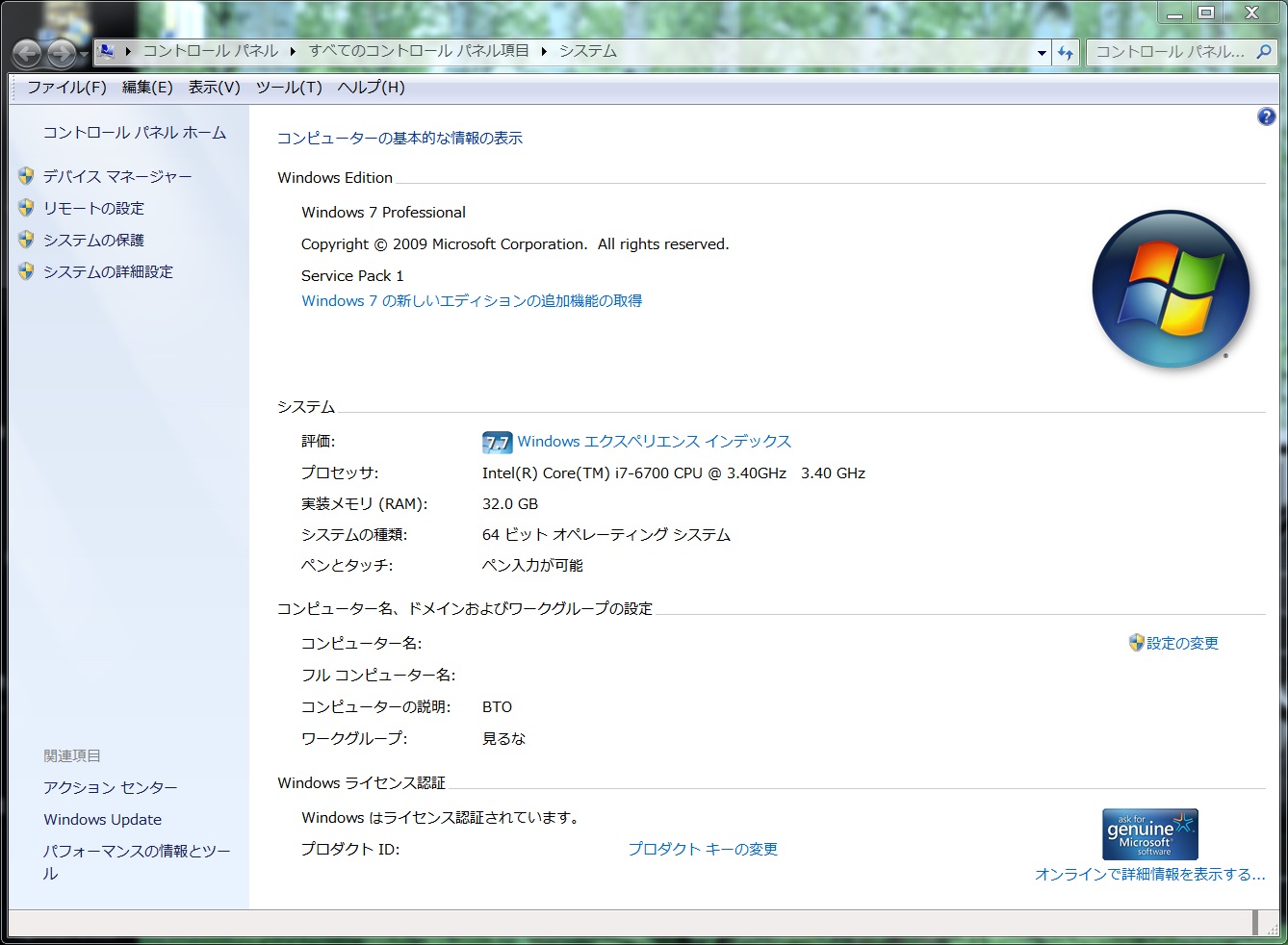 ●PC BTO Core i7-6700 win7 Pro 64ビット(2016年9月から2024年11月)